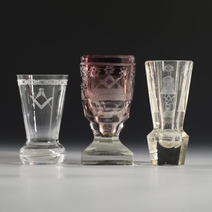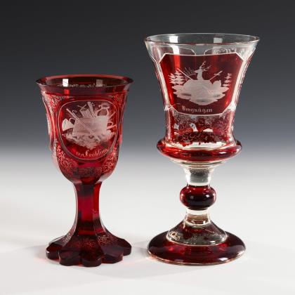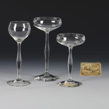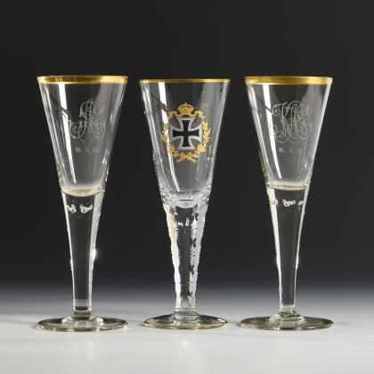 1x um 1914: konische, in den facettierten Schaft mit eingestochenen Luftblasen und geschlägelten Kanten übergehende Kuppa, Rundfuß; schauseitig ein geätztes Eisernes Kreuz im Lorbeerkranz, datiert "1914". / 2x 1921: konische, in den massiven Schaft mit eingestochenen Luftblasen übergehende Kuppa, Rundfuß; schauseitig das gravierte und datierte Monogramm "KAS" bzw. "AS" "18.5.21."