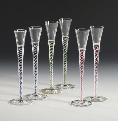 Konische, in den hohen Schaft mit eingeschmolzenen grünen, blauen, roten und weißen Spiralfäden übergehende Kuppa, Rundfuß
