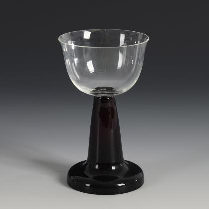 Bauchige, in den massiven Schaft mit eingeschmolzenem, weißem Spiralfaden übergehende Kuppa, Rundfuß; ausgekugelter Abriss. 1x mit dem gravierten Monogramm "GM"