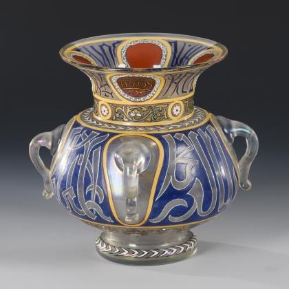 Bauchiger Korpus mit vier angeschmolzenen Ösen, Kraterhals, Rundfuß; ausgekugelter Abriss. Emailbemalt mit Schriftzeichen im arabischen Stil und Floralelementen