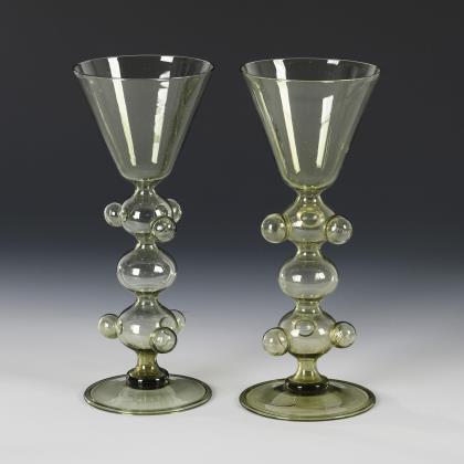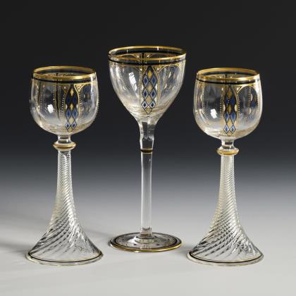 2 Römer: bauchige Kuppa, spiraloptischer Trompetenfuß. / 1 Kelchglas: halbovoide, am Ansatz facettierte Kuppa, Stängel, Runduß. Auf der Kuppa ein geometrisches Dekor in Gold, Blau, Weiß und Schwarz