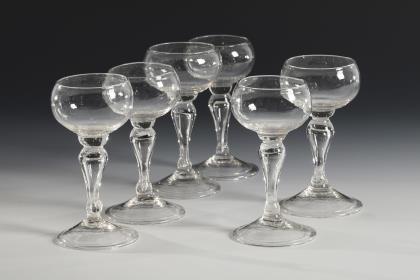 6 gleiche Gläser mit bauchiger Kuppa, Balusterhohlschaft, Rundfuß mit umgeschlagenem Rand; Abriss