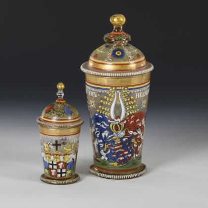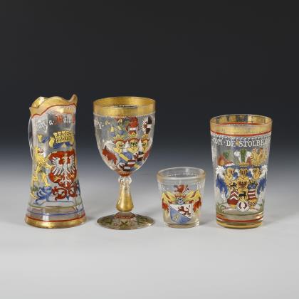 4x mit Wappenschliff: konischer Pokal (H 28,5 cm), konisches Kelchglas mit gedrehtem Schaft (H 22 cm), Römerkanone (H 14 cm) und Kelchglas mit getrepptem Rundfuß (H 13,5 cm). / 2x mit Monogramm: Bierstange mit dem Monogramm "ICR" (H 23 cm) und Kelchglas mit Monogramm (H 20,5 cm)
