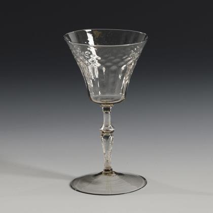 Glockenkuppa mit optischem Waben- und Rippenmuster, schlanker, längsoptisch geblasener Hohlbalusterschaft, Rundfuß; Abriss