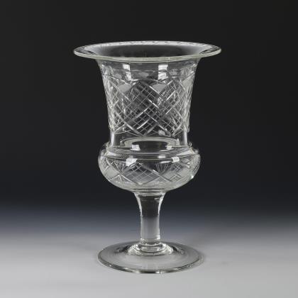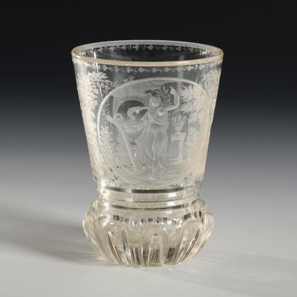 Konischer Becher mit hochgeschliffenen, kerbschliffverzierten Zungen am Stand; ausgekugelter Abriss. Schauseitig ein fein graviertes Medaillon mit der Darstellung der Personifikation der Hoffnung mit dem Anker, flankiert von üppigen Blütenzweigen, verso eine floral gerahmte Linse
