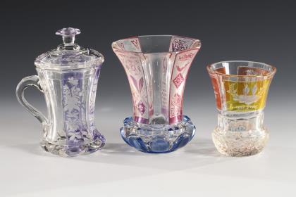 1x facettierter, partiell violett lasierter Henkelbecher mit Knaufdeckel und gravierten Blumenbuketts (H 15,5 cm). / 1x teils gelb bzw. rot lasierter Fußbecher mit Facetten-, Kerb- und Steinelschliff sowie gravierten Symbolarrangements "Glaube, Hoffnung und Liebe" (H 11 cm). / 1x großer, teils rosa und blau lasierter Fußbecher mit facettierter Wandung, hochgeschliffenen Zungen am Stand, gravierten Ornamenten und einer geätzten Darstellung eines Landsknechtes (H 13 cm)