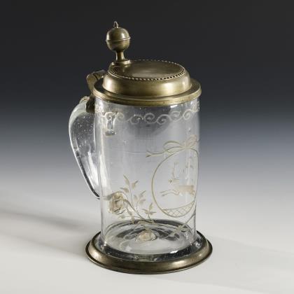 Walzenkrug mit Bandhenkel sowie zinnmontiertem Stand und Scharnierdeckel. Schauseitig das gravierte Motiv eines springenden Hirsches in einem schleifenbekrönten Medaillon