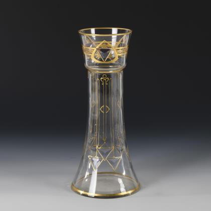 Konkave Form mit konischem Hals; ausgekugelter Abriss. Auf der Wandung dreifach geschliffene Abhängungen mit einem steinelgeschliffenen Dreieck, auf dem Hals reliefgoldgemalte Lorbeerranken und drei steinelgeschliffene, rosagebeizte Dreiecke