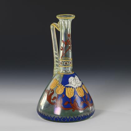 Konischer Korpus, Enghals, geschwungener Henkel. Schauseitig die Darstellung eines Tulpenbandes mit zwei Engelsköpfen auf blauem Fondschild