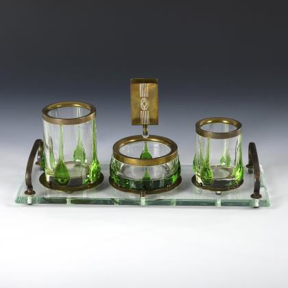 3 zylindrische Gefäße mit metallmontiertem Rand: Aschenbecher mit Halterung für die Streichholzschachtel (Ø 9 cm), Becher als Zigarettenbehälter (H 8 cm) und Becher als Zigarrenbehälter (H 10 cm). Rechteckiges Glastablett mit metallmontierten Henkeln und drei Standringen für die Gefäße (14 x 34 cm)
