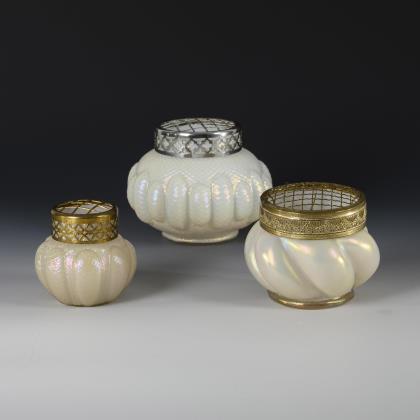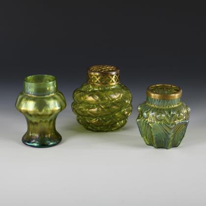 1x LÖTZ, "Rusticana": konkave Vase mit ausgestellter Schulter und zylindrischem Hals; ohne Metallaufsatz (H 13 cm). / 1x oktogonale formgeblasene Vase mit Aststruktur und Metallaufsatz (H 12 cm). / 1x vierfach gegliederte Vase mit Wabenstruktur, zylindrischem Hals und Metallaufsatz (H 12,5 cm)
