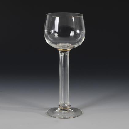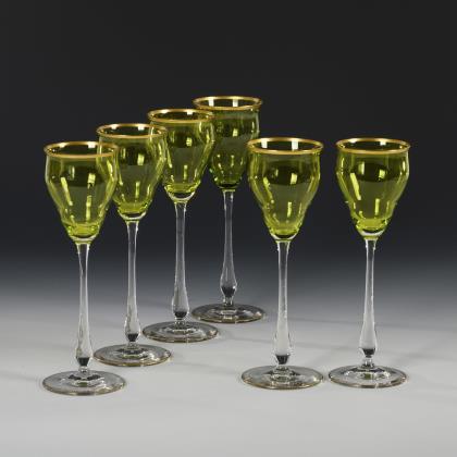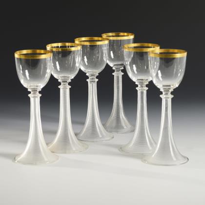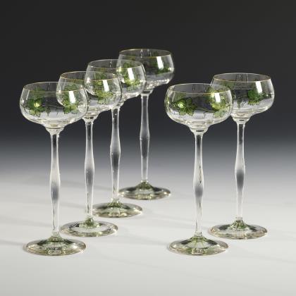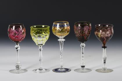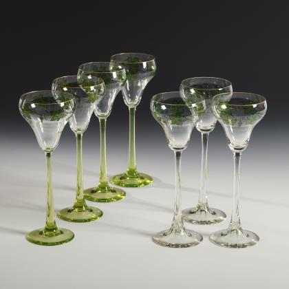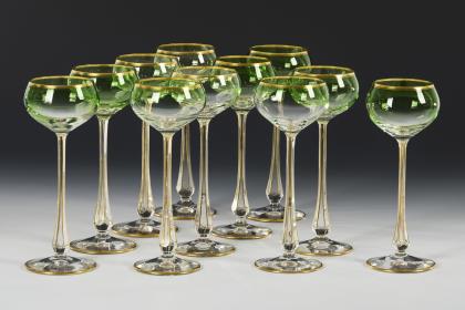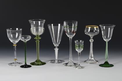 1x Historismus-Weinglas (H 22 cm). / 1x KÖLN-EHRENFELD, Ätzsignatur, um 1893: Spitzkelch mit Spiralfuß (H 19 cm). / 1x wohl Regenhütte: Römer aus farblosem Glas mit wabenfacettiertem Trompetenschaft und Goldrand (H 18,5 cm). / 1x KÖLN-EHRENFELD oder JOSEPHINENHÜTTE: Kelchglas aus farblosem Glas mit weiß-grün gestreiftem Stängel und Rundfuß aus grünem Glas (H 20 cm). / 2x THERESIENTHAL, um 1905/10: Likörglas "1531" mit dem Dekor "Liane" (H 13 cm) und Römer "1751" mit roten Tropfen und grünem Faden (H 22 cm). / 1x THERESIENTHAL, vor 2009: Weinglas aus der Trinkglasgarnitur "Graziella", aus farblosem Glas mit vergoldeten Nodi (H 18 cm). / 1x Likörlglas mit optisch geblasener Kuppa aus farblosem Glas und grünem Stängel (H 15 cm)