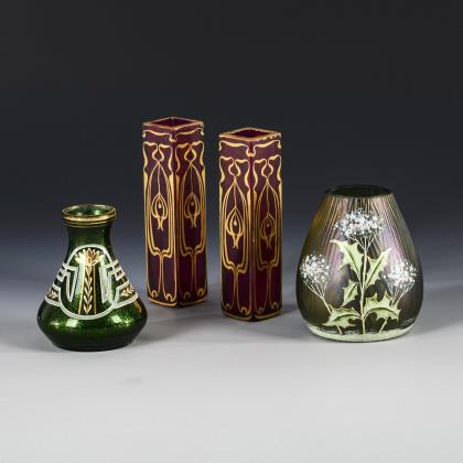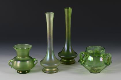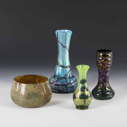 2x GLASFABRIK ELISABETH: Vase aus opakviolettem, irisiertem Glas mit Fadennetz (H 18 cm) und Vase aus farblosem, irisiertem Glas mit hellblauem, opalinem Innenfang und violettem Fadennetz (H 23,5 cm). / 1x Josef Knizek, GLASFABRIK ANTONIENHÜTTE, Ullersdorf/Teplitz: Schale aus farblosem Glas mit eingebrannten Silbersalz-Beizen, sogenanntes "Pandora-Glas" (H 9 cm, Ø 14 cm). / 1x Birnväschen aus hellgrünem, irisiertem Glas mit schauseitig emailgemalten, stilisierten Bäumen (signiert "W.G[?] 4/363; H 15 cm)
