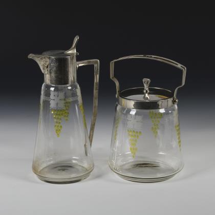 Konische Keksdose und konischer Krug mit metallmontierter Mündung bzw. Scharnierdeckel und Henkel. Auf der Wandung ein graviertes Weindekor mit gelben Weintrauben