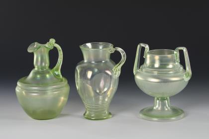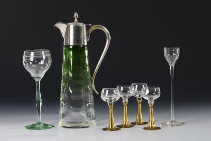 1x konischer, wabenoptisch geblasener Krug aus farblosem Glas mit grün verlaufendem Überfang und metallmontiertem Henkel, Hals und Scharnierdeckel (H 29,5 cm). / 4x Likörgläser aus farblosem Glas mit vergoldetem Zinnfuß (dieser bezeichnet "Osiris" und gemarkt mit dem Stempel der Nürnberger Kunstgewerbeschule; H 10,5 cm). / 1x Weinglas mit vegetabil gravierter Kuppa aus farblosem Glas sowie Stängel und Rundfuß aus Uranglas (H 20 cm). / 1x Likörglas aus farblosem Glas mit graviertem Linien- und Tropfendekor, hoher Stängel, Rundfuß (H 20 cm)