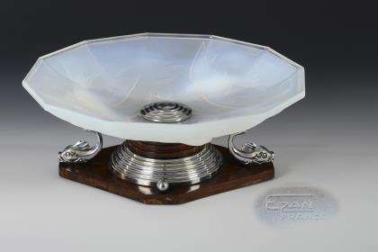 Polygonale Schale aus formgepresstem Opalglas mit Schwalbenrelief, auf einem konischen, getreppten Fuß aus Holz und Metall, Fußplatte aus Holz mit zwei Metallkugeln und zwei plastischen Delfinen