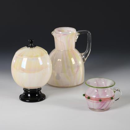 2x Entwurf von Jean Beck (1862-1938), um 1918: Krug (H 16 cm) und Bonboniere (H 17 cm) aus farblosem Glas mit rosa und gelb marmoriertem Opalglasinnenfang. / 1x Entwurf wohl von Georg Carl von Reichenbach (1872-1940): Henkelbecher mit Kraterrand, aus farblosem Glas mit rosa marmoriertem Opalglasinnenfang und grünem Rand, Korpus mit einem feinen roten Faden umsponnen und mit aufgelegten grünen Glastropfen (H 7,5 cm)