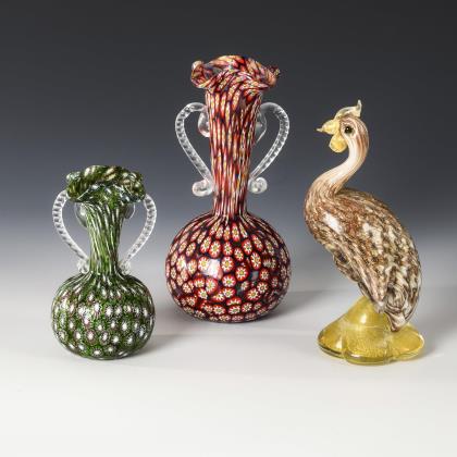1x Vogel aus farblosem Glas mit eingeschmolzenem Luftblasenmuster sowie Einschmelzungen von Opalweiß, Kupferaventurin und Goldfolie (H 17 cm). / 2 formgleiche Vasen aus farblosem Glas mit Kugelkorpus, trichterförmigem Hals, vierpassiger Mündung und zwei Henkeln: 1x mit eingeschmolzenen Murrinen in Rot und 1x mit eingeschmolzenen Murrinen in Grün (H 18 und 12 cm)