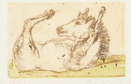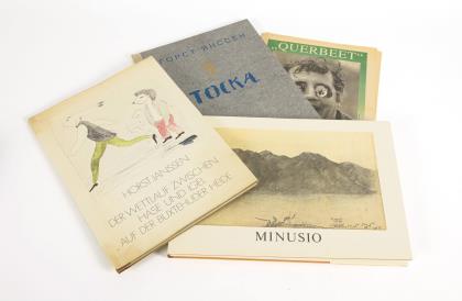 "Der Wettlauf zwischen Hase und Igel auf der Buxtehuder Heide", Faksimileausgabe des Originals, 1973, (42 x 30 cm)., Altersspuren. / "Minusio", Verlag Ullstein, 1973, im Leineneinband mit Schutzumschlag und Schuber, (31,5 x 44 cm). / "Toska", Buchausgabe in kyrilischer Schrift, Arkana Verlag 1981, Göttingen. Halbleineneinband, (42,5 x 30,5 cm). / 2x "Querbeet", Sonderdruck des Hamburger Abendblattes zum 70. Geburtstag von Horst Janssen, anläßlich der Ausstellung ... 1999", 8 Seiten ( 40 x 28,5 cm)