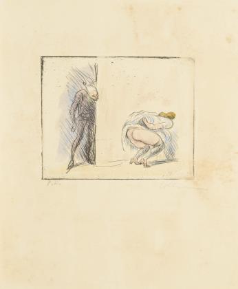 "Flüchtende", Radierung auf Seidenpapier, (Blatt 20 x 13,5 cm) / Kolorierte Radierung, Handsignatur, (Blatt 19,5 x 16 cm), etwas fleckig