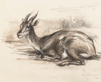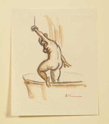 Auf dem getönten Blatt leichte Spuren einer weiteren Skizze