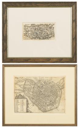 "Belegering van Bon", Kupferstich, (23 x 56 cm; Rahmen 43 x 76 cm) / "Belagerung der Königl. Preußischen Stadt und Vestung Schweidnitz ...1757", kolorierter Kupferstich, (17 x 30 cm; Rahmen 39 x 45 cm)