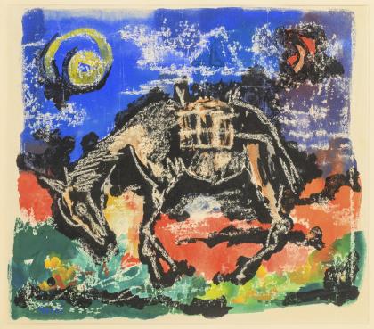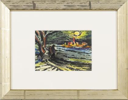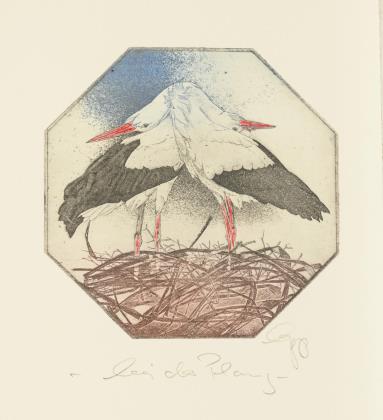 Mappe mit 10 Originalholzschnitten, handgedruckt, nummeriert 1/5 (Auflage 30 Exemplare und 5 Vorzugsexemplare). Vollständig, ein kolorierter Holzschnittt gerahmt. Blätter mit unterschiedlichen Auflagennummern