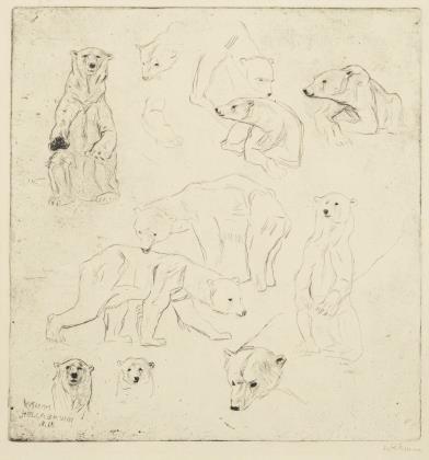 Druckgrafische Vervielfältigung eines Studienblattes von Eisbären, in verschiedenen Haltungen und Ausarbeitungsstadien, unten links auf der Druckplatte signiert mit "WKlemm/Hellabrunn .8.18"