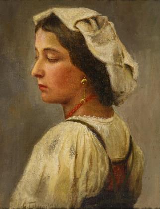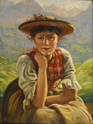 Bildnis einer jungen Frau in ländlicher Kleidung vor neutralem Hintergrund