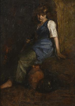 Neben zwei Krügen sitzende junge Frau in bäuerlicher Kleidung