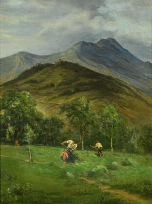 Bauern auf der Wiese beim Rechen des geschnittenen Grases unterhalb eines Berges mit zwei Burgruinen