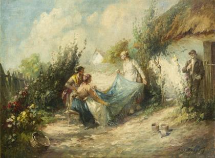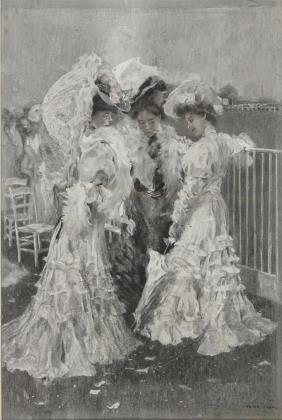 Jugendstilgemälde mit drei jungen Damen im Gespräch an einem Zaun