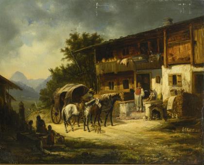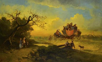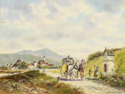 HEICHELE, Max (1890 München - 1979 ebd.). Postkutsche vor dem Dorf.