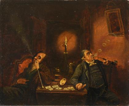 Kartenspieler am Abend an einem Tisch im Lampenschein
