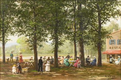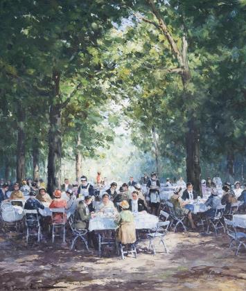Impressionistisch angelegte Genreszene in der Manier von Max Liebermann (1847-1935). In einer lichten Farbigkeit, die durch Schatten- und Lichtwechsel Ruhe und Harmonie ausstrahlt, und einem schwungvollen Farbauftrag gemalt. Profilierter Rahmen mit Pariser Klebezetteln