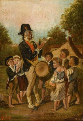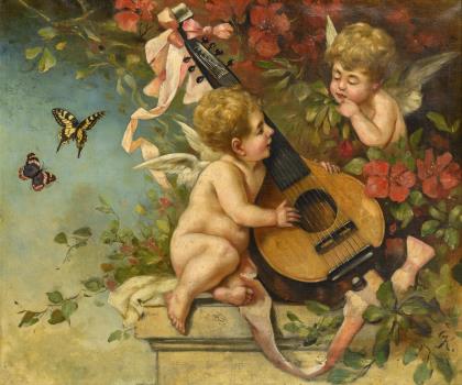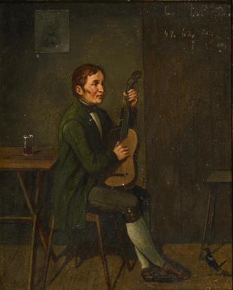 In Spitzwegmanier gemalter junger Mann beim Laute spielen und Singen vor einem Vogelkäfig