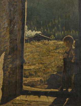 Expressiv gemalte Studie mit dem Bauernpaar und den schemenhaft erkennbaren Tieren vor der Wand des Stalls