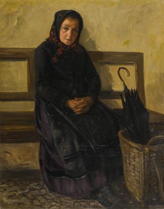 Ältere Dame in schwarz-violetter Kleidung mit geblümtem, schwarzen Kopftuch auf einer Bank