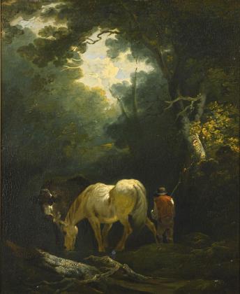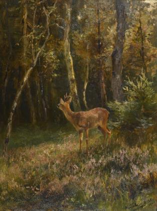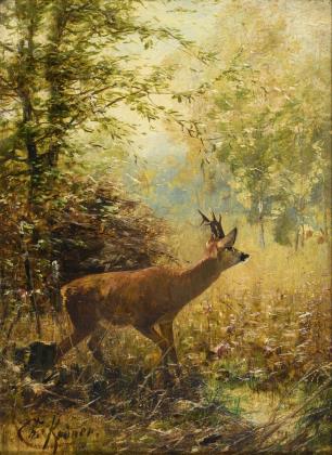 Das Tier beim vorsichtigen Verlassen der schützenden Bäume an einem sonnigen Tag. Siehe auch Kat.-Nr. 457 Konvolut des Malers mit dessen Totenmaske