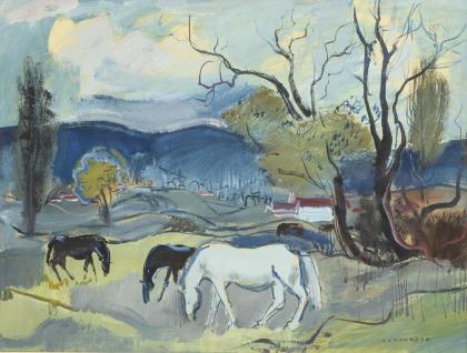 LANDGREBE, Heinrich (1908 München - 1990). Pferde in Voralpenlandschaft.