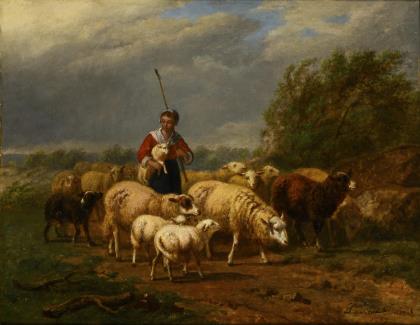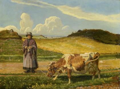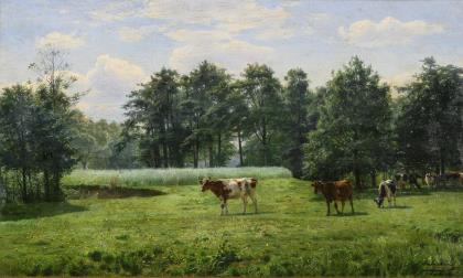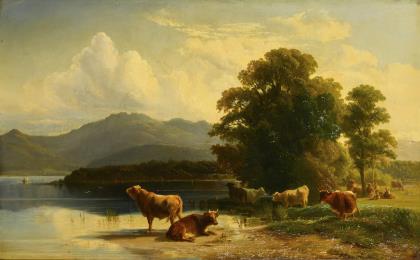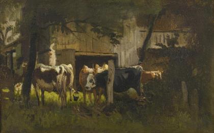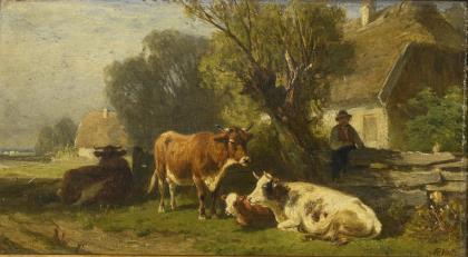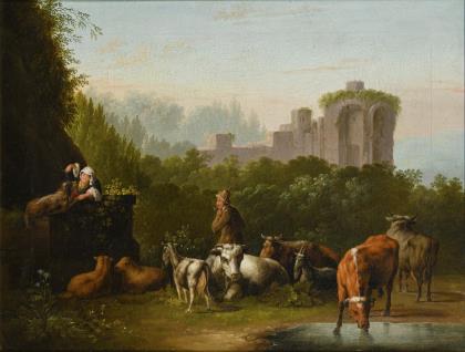 Stimmungsvolle romantische Ansicht mit Weidevieh in der Tränke. Schwerer vergoldeter Stuckrahmen
