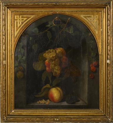 Pfirsiche und Trauben in einer Wandnische neben Johannisbeeren und Pflaumen
