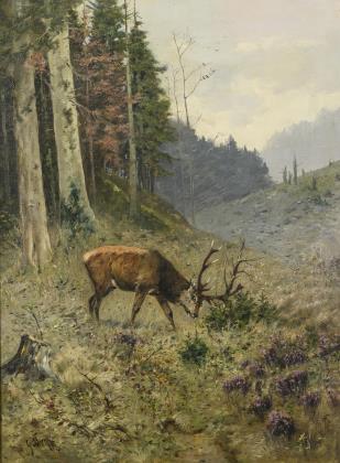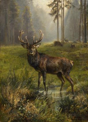 WEINBERGER, Anton (1843 München - 1912 Wiesbaden). Hirsch auf Waldlichtung.