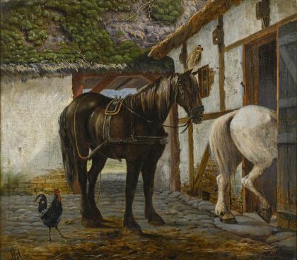 Zwei Pferde und ein Hahn am Eingang des Stalls im Hof