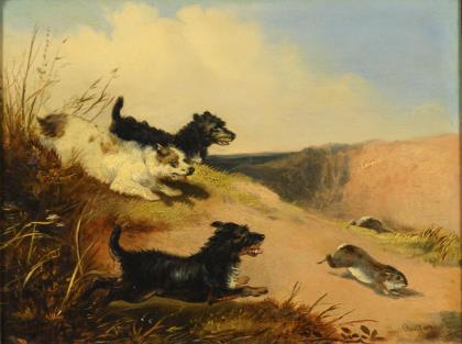 Die Hunde bei der Hatz auf den Hasen in bergigem Land