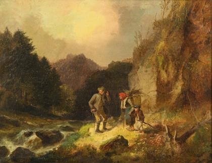 Alter Jägersmann im Gespräch mit einem Mütterchen und deren Enkel im Sonnenschein an einem Bach
