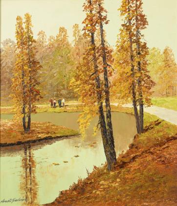 Herbstliche Landschaft mit Personen auf einem Weg nahe dem Flussufer