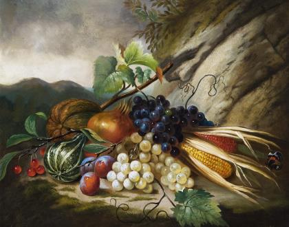 CORREGGIO, Joseph (1810 Wolfratshausen - 1891 München). Früchtestillleben vor Landschaft.