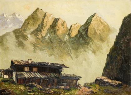 Teils pastos gemalte Gebirgslandschaft mit Alpenhaus an einer nebligen Schlucht vor den Gipfeln