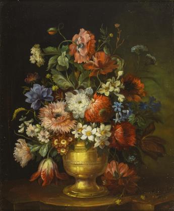 Großer Blumenstrauß mit prächtigen Blumen in goldener Vase